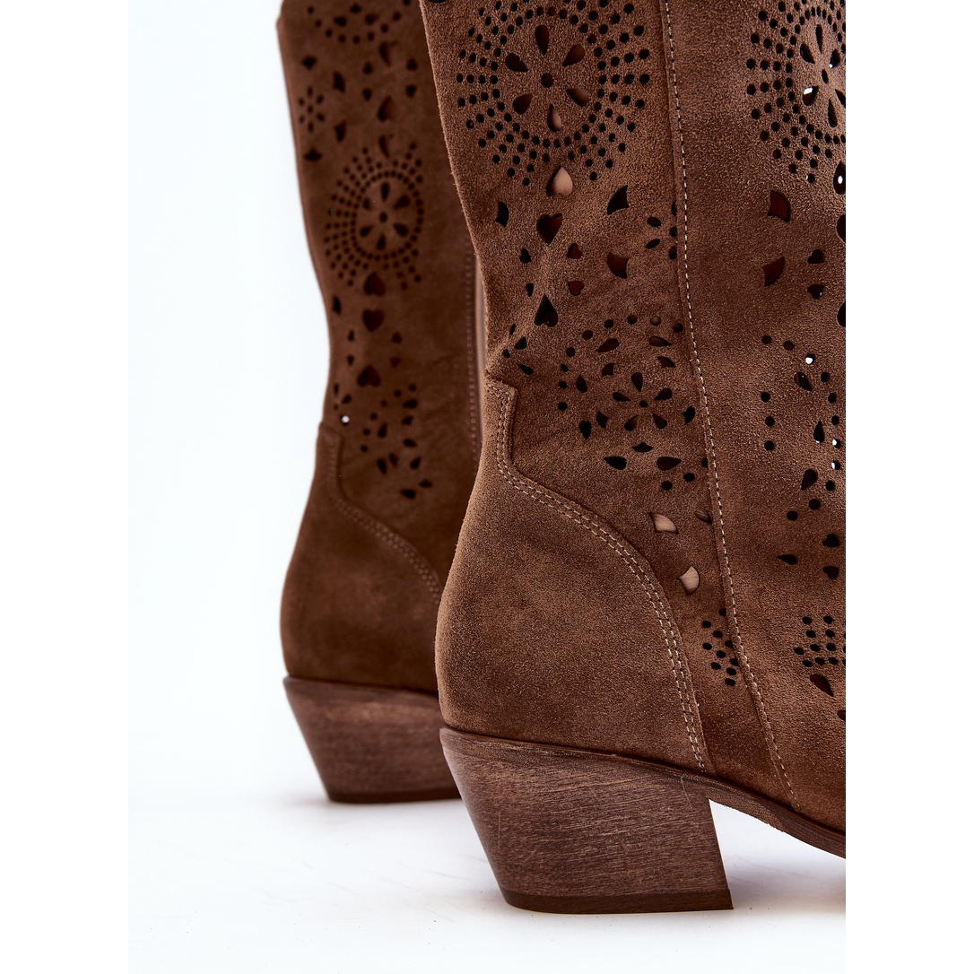 Upptäck en ny definition av stil och komfort med säsongens senaste hit - Zazoo 3396, brun, mocka, genombrutna mid-calf boots. Dessa unika skor kommer att tillföra en fläkt av friskhet till din garderob, och kombinerar klassisk elegans med en hint av vilda västern, tack vare deras cowboystil.